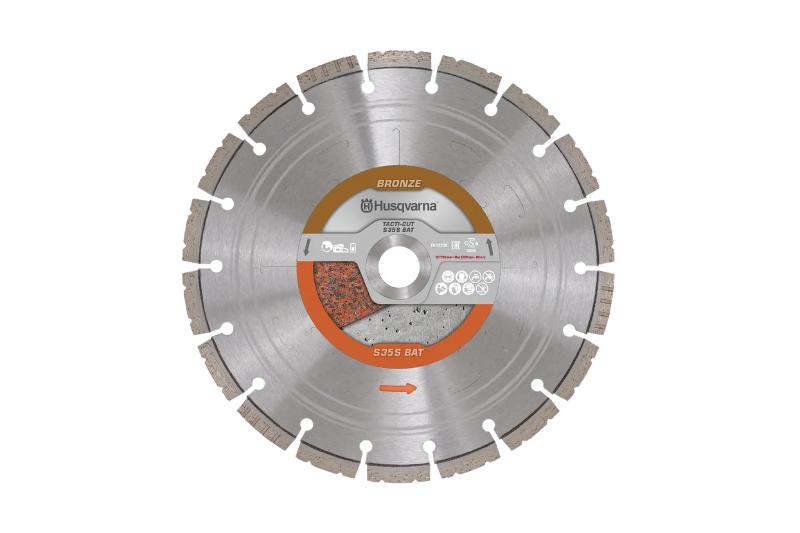 Het diamantblad Tacti-Cut S35S BAT van Husqvarna heeft een doorsnede van 250 mm. Het blad past op de K540i accudoorslijper van Husqvarna.